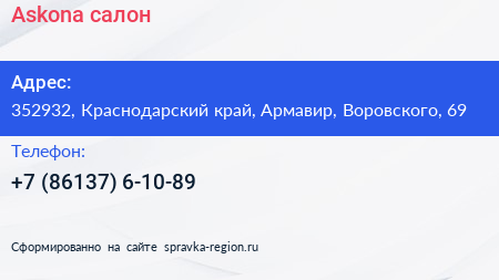 Askona, салон по адресу 352932, Краснодарский край, Армавир, Воровского, 69 в дальнейшем Организация, размещена в следующих категориях: