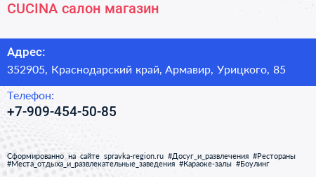 CUCINA, салон-магазин по адресу 352905, Краснодарский край, Армавир, Урицкого, 85 в дальнейшем Организация, размещена в следующих категориях: