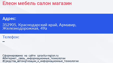 Елеон-мебель, салон-магазин по адресу 352905, Краснодарский край, Армавир, Железнодорожная, 49а в дальнейшем Организация, размещена в следующих категориях: