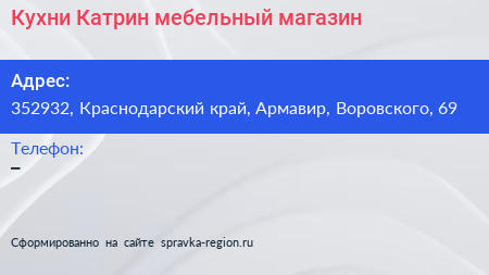 Кухни Катрин, мебельный магазин по адресу 352932, Краснодарский край, Армавир, Воровского, 69 в дальнейшем Организация, размещена в следующих категориях: