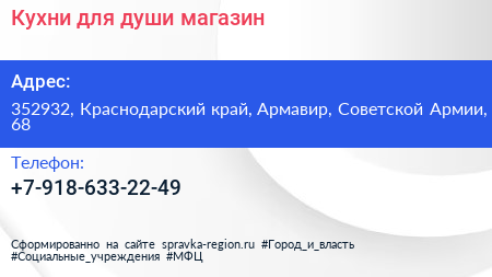 Кухни для души, магазин по адресу 352932, Краснодарский край, Армавир, Советской Армии, 68 в дальнейшем Организация, размещена в следующих категориях: