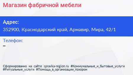 Магазин фабричной мебели по адресу 352900, Краснодарский край, Армавир, Мира, 42/1 в дальнейшем Организация, размещена в следующих категориях: