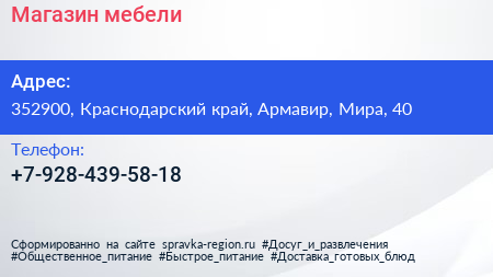 Магазин мебели по адресу 352900, Краснодарский край, Армавир, Мира, 40 в дальнейшем Организация, размещена в следующих категориях: