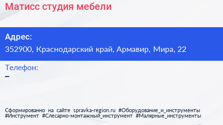 Матисс, студия мебели по адресу 352900, Краснодарский край, Армавир, Мира, 22 в дальнейшем Организация, размещена в следующих категориях: