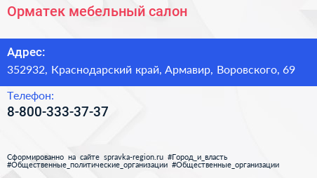 Орматек, мебельный салон по адресу 352932, Краснодарский край, Армавир, Воровского, 69 в дальнейшем Организация, размещена в следующих категориях: