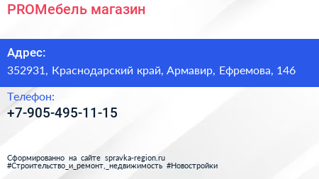 PROМебель, магазин по адресу 352931, Краснодарский край, Армавир, Ефремова, 146 в дальнейшем Организация, размещена в следующих категориях: