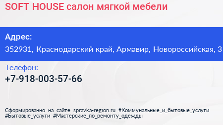 SOFT HOUSE, салон мягкой мебели по адресу 352931, Краснодарский край, Армавир, Новороссийская, 3 в дальнейшем Организация, размещена в следующих категориях: