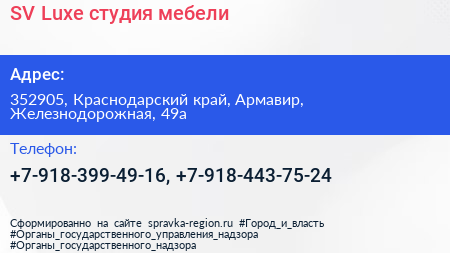 SV-Luxe, студия мебели по адресу 352905, Краснодарский край, Армавир, Железнодорожная, 49а в дальнейшем Организация, размещена в следующих категориях: