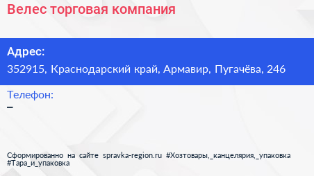Велес, торговая компания по адресу 352915, Краснодарский край, Армавир, Пугачёва, 246 в дальнейшем Организация, размещена в следующих категориях: