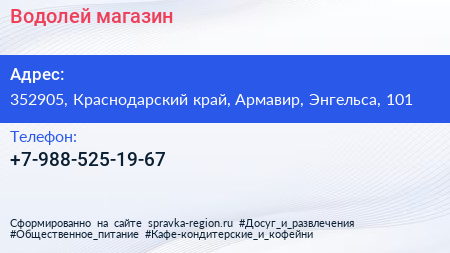 Водолей, магазин по адресу 352905, Краснодарский край, Армавир, Энгельса, 101 в дальнейшем Организация, размещена в следующих категориях: