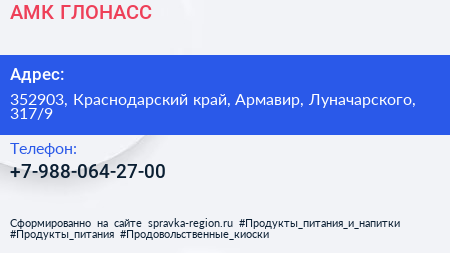 АМК ГЛОНАСС по адресу 352903, Краснодарский край, Армавир, Луначарского, 317/9 в дальнейшем Организация, размещена в следующих категориях: