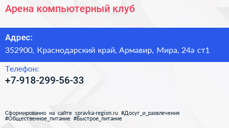 Арена, компьютерный клуб по адресу 352900, Краснодарский край, Армавир, Мира, 24а ст1 в дальнейшем Организация, размещена в следующих категориях: