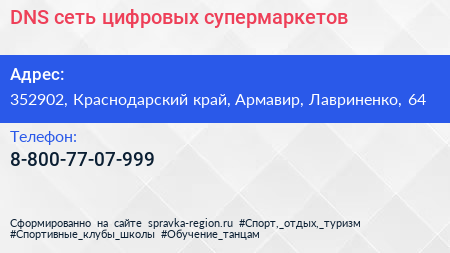 DNS, сеть цифровых супермаркетов по адресу 352902, Краснодарский край, Армавир, Лавриненко, 64 в дальнейшем Организация, размещена в следующих категориях: