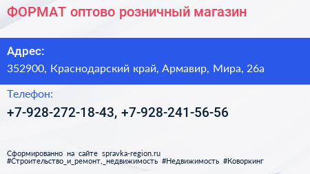 ФОРМАТ, оптово-розничный магазин по адресу 352900, Краснодарский край, Армавир, Мира, 26а в дальнейшем Организация, размещена в следующих категориях: