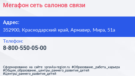 Мегафон, сеть салонов связи по адресу 352900, Краснодарский край, Армавир, Мира, 51а в дальнейшем Организация, размещена в следующих категориях: