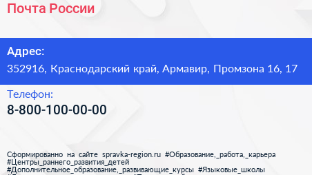 Почта России по адресу 352916, Краснодарский край, Армавир, Промзона 16, 17 в дальнейшем Организация, размещена в следующих категориях: