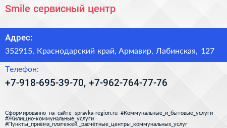 Smile, сервисный центр по адресу 352915, Краснодарский край, Армавир, Лабинская, 127 в дальнейшем Организация, размещена в следующих категориях: