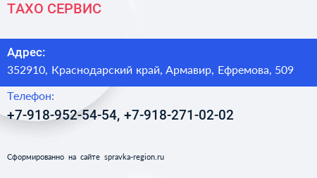 ТАХО-СЕРВИС по адресу 352910, Краснодарский край, Армавир, Ефремова, 509 в дальнейшем Организация, размещена в следующих категориях: