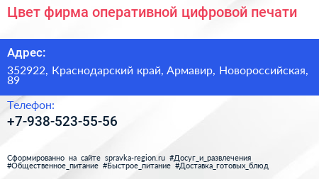 Цвет, фирма оперативной цифровой печати по адресу 352922, Краснодарский край, Армавир, Новороссийская, 89 в дальнейшем Организация, размещена в следующих категориях:
