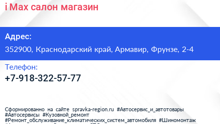 i-Max, салон-магазин по адресу 352900, Краснодарский край, Армавир, Фрунзе, 2-4 в дальнейшем Организация, размещена в следующих категориях:
