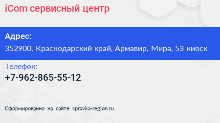 iCom, сервисный центр по адресу 352900, Краснодарский край, Армавир, Мира, 53 киоск в дальнейшем Организация, размещена в следующих категориях: