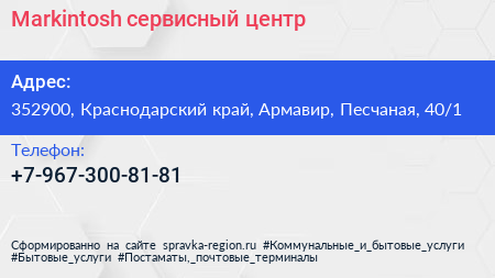 Markintosh, сервисный центр по адресу 352900, Краснодарский край, Армавир, Песчаная, 40/1 в дальнейшем Организация, размещена в следующих категориях:
