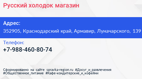 Русский холодок, магазин по адресу 352905, Краснодарский край, Армавир, Луначарского, 139 в дальнейшем Организация, размещена в следующих категориях: