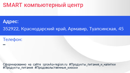 SMART, компьютерный центр по адресу 352922, Краснодарский край, Армавир, Туапсинская, 45 в дальнейшем Организация, размещена в следующих категориях: