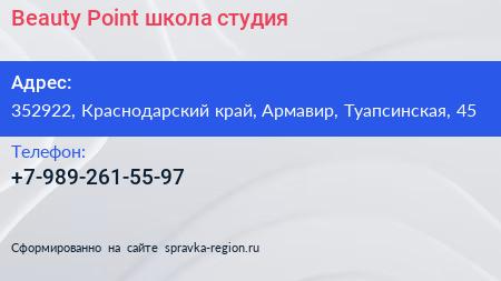 Beauty Point, школа-студия по адресу 352922, Краснодарский край, Армавир, Туапсинская, 45 в дальнейшем Организация, размещена в следующих категориях:
