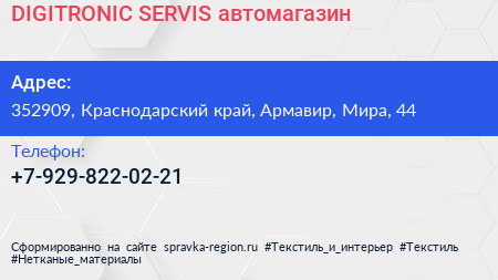 DIGITRONIC SERVIS, автомагазин по адресу 352909, Краснодарский край, Армавир, Мира, 44 в дальнейшем Организация, размещена в следующих категориях: