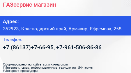 ГАЗсервис, магазин по адресу 352923, Краснодарский край, Армавир, Ефремова, 258 в дальнейшем Организация, размещена в следующих категориях: