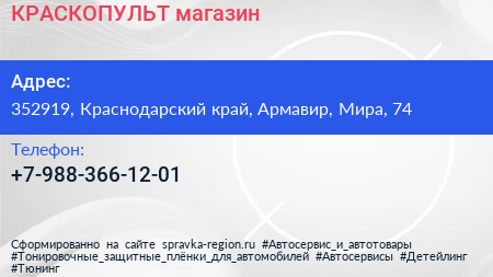 КРАСКОПУЛЬТ, магазин по адресу 352919, Краснодарский край, Армавир, Мира, 74 в дальнейшем Организация, размещена в следующих категориях: