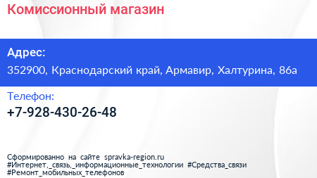 Комиссионный магазин по адресу 352900, Краснодарский край, Армавир, Халтурина, 86а в дальнейшем Организация, размещена в следующих категориях:
