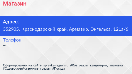 Магазин по адресу 352905, Краснодарский край, Армавир, Энгельса, 121а/6 в дальнейшем Организация, размещена в следующих категориях: