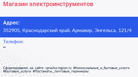 Магазин электроинструментов по адресу 352905, Краснодарский край, Армавир, Энгельса, 121/4 в дальнейшем Организация, размещена в следующих категориях: