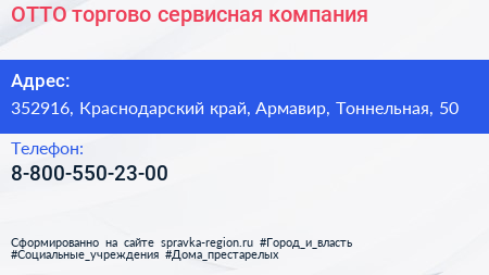 ОТТО, торгово-сервисная компания по адресу 352916, Краснодарский край, Армавир, Тоннельная, 50 в дальнейшем Организация, размещена в следующих категориях: