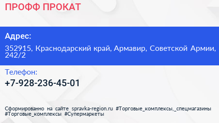 ПРОФФ-ПРОКАТ по адресу 352915, Краснодарский край, Армавир, Советской Армии, 242/2 в дальнейшем Организация, размещена в следующих категориях:
