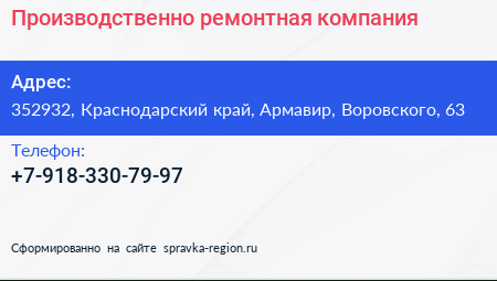 Производственно-ремонтная компания по адресу 352932, Краснодарский край, Армавир, Воровского, 63 в дальнейшем Организация, размещена в следующих категориях: