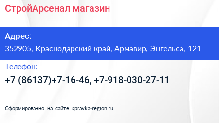 СтройАрсенал, магазин по адресу 352905, Краснодарский край, Армавир, Энгельса, 121 в дальнейшем Организация, размещена в следующих категориях: