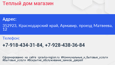 Теплый дом, магазин по адресу 352923, Краснодарский край, Армавир, проезд Матвеева, 12 в дальнейшем Организация, размещена в следующих категориях: