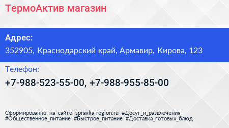 ТермоАктив, магазин по адресу 352905, Краснодарский край, Армавир, Кирова, 123 в дальнейшем Организация, размещена в следующих категориях:
