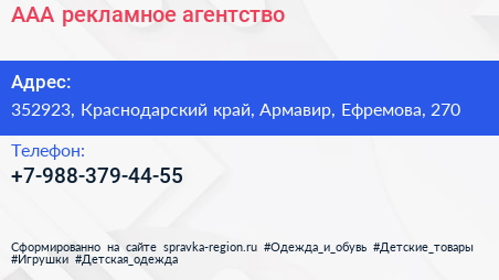 ААА, рекламное агентство по адресу 352923, Краснодарский край, Армавир, Ефремова, 270 в дальнейшем Организация, размещена в следующих категориях: