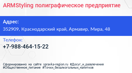 ARMStyling, полиграфическое предприятие по адресу 352909, Краснодарский край, Армавир, Мира, 48 в дальнейшем Организация, размещена в следующих категориях: