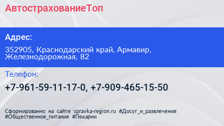 АвтострахованиеТоп по адресу 352905, Краснодарский край, Армавир, Железнодорожная, 82 в дальнейшем Организация, размещена в следующих категориях: