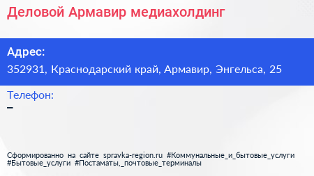 Деловой Армавир, медиахолдинг по адресу 352931, Краснодарский край, Армавир, Энгельса, 25 в дальнейшем Организация, размещена в следующих категориях:
