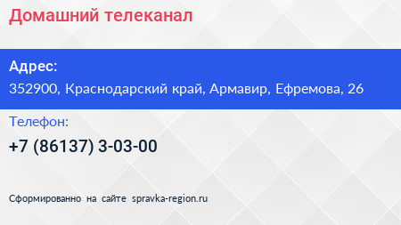 Домашний, телеканал по адресу 352900, Краснодарский край, Армавир, Ефремова, 26 в дальнейшем Организация, размещена в следующих категориях:
