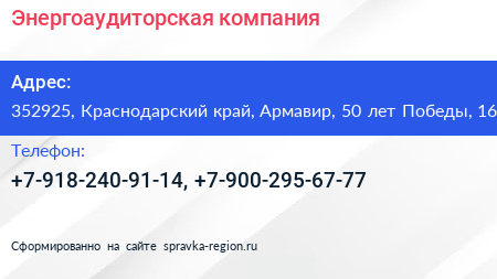 Энергоаудиторская компания по адресу 352925, Краснодарский край, Армавир, 50 лет Победы, 16 в дальнейшем Организация, размещена в следующих категориях:
