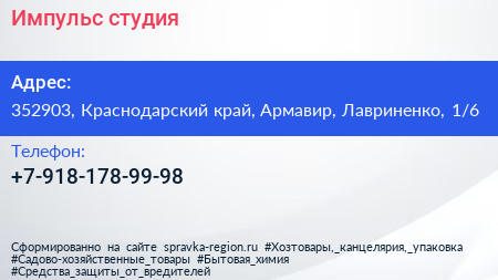 Импульс, студия по адресу 352903, Краснодарский край, Армавир, Лавриненко, 1/6 в дальнейшем Организация, размещена в следующих категориях: