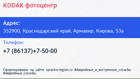 KODAK, фотоцентр по адресу 352900, Краснодарский край, Армавир, Кирова, 53а в дальнейшем Организация, размещена в следующих категориях: