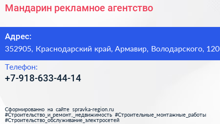 Мандарин, рекламное агентство по адресу 352905, Краснодарский край, Армавир, Володарского, 120 в дальнейшем Организация, размещена в следующих категориях: